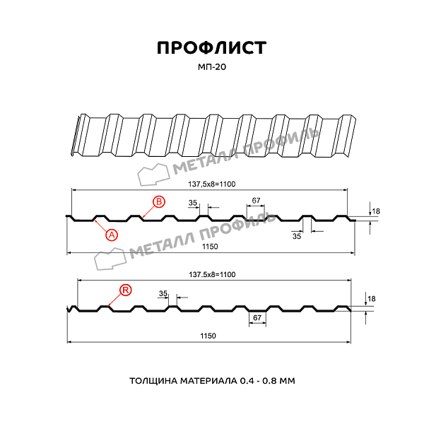 Профиль МП-20 относится к универсальным cтройматериалам. В отличие от многих других видов профлиста, этот выпускается в трёх вариациях: А, В и R. Типы А и В применяются для кровельных работ, возведения заборов, облицовки стен, для внутренней обшивки промышленных помещений, гаражей, ангаров и т.п. Профиль МП-20 с маркировкой R характеризуется наличием специального желобка для отвода конденсата и используется для обустройства кровли. В зависимости от зоны применения, МП-20 выпускается из оцинкованной стали толщиной от 0,4 до 0,8 мм. Важная деталь: несмотря на цифру 20 в названии, реальная высота этого профнастила – 18 мм. Он является материалом бюджетной ценовой категории и обладает доступной ценой. МП-20 – надёжный и качественный стройматериал, характеристики которого по достоинству оценивают не только частные домовладельцы, но и крупные застройщики. Он обладает хорошей жёсткостью, переносит большие статические нагрузки и эффективно противостоит нагрузкам динамическим.